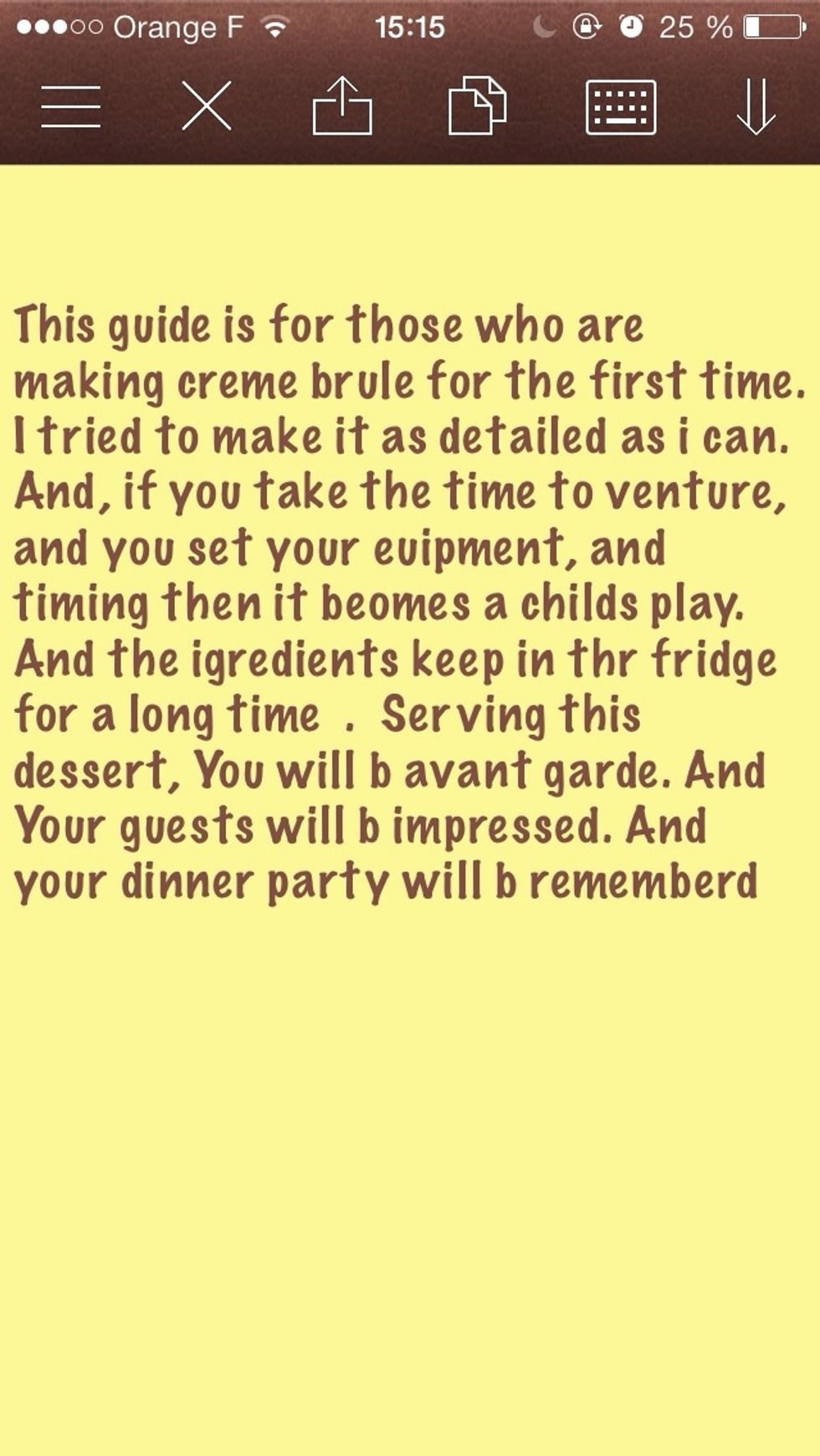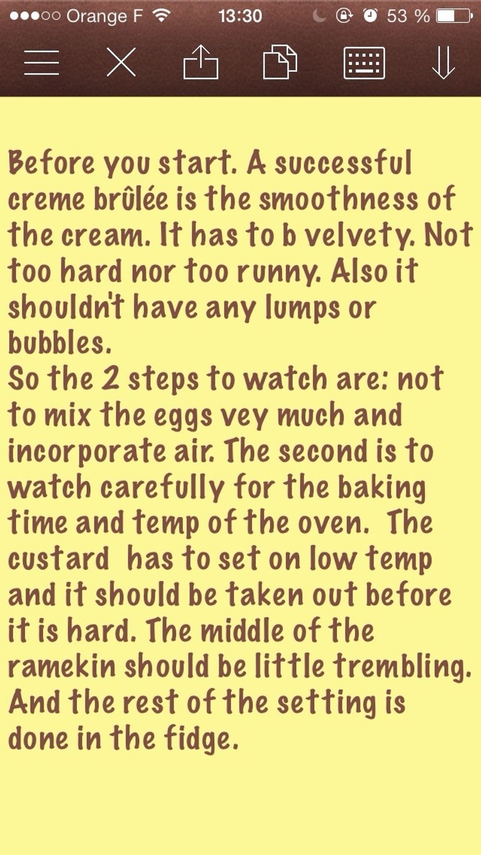 equipment needed: A mixing bowl, wire whisk, spatula, cooking pot, ramekins and a baking tray for the Bain marie. Then a blow torch which fascilitates the burning of the top sugar. Also...➡️
