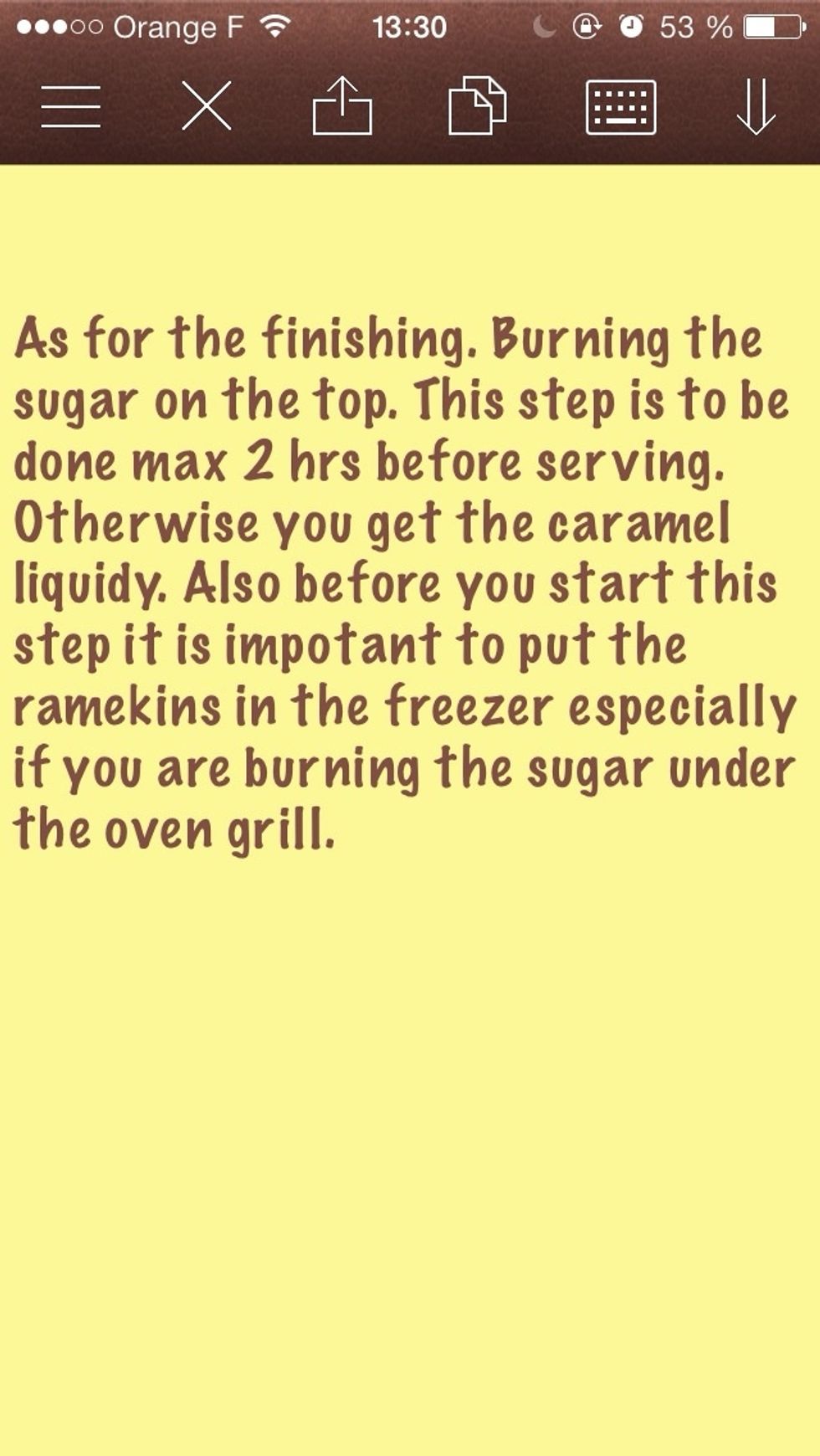 When you want to serve the creme brûlée, you need to burn the sugar on the There might b some condensation from the fridge. U could just tap it gently using a kitchen paper before you put the sugar