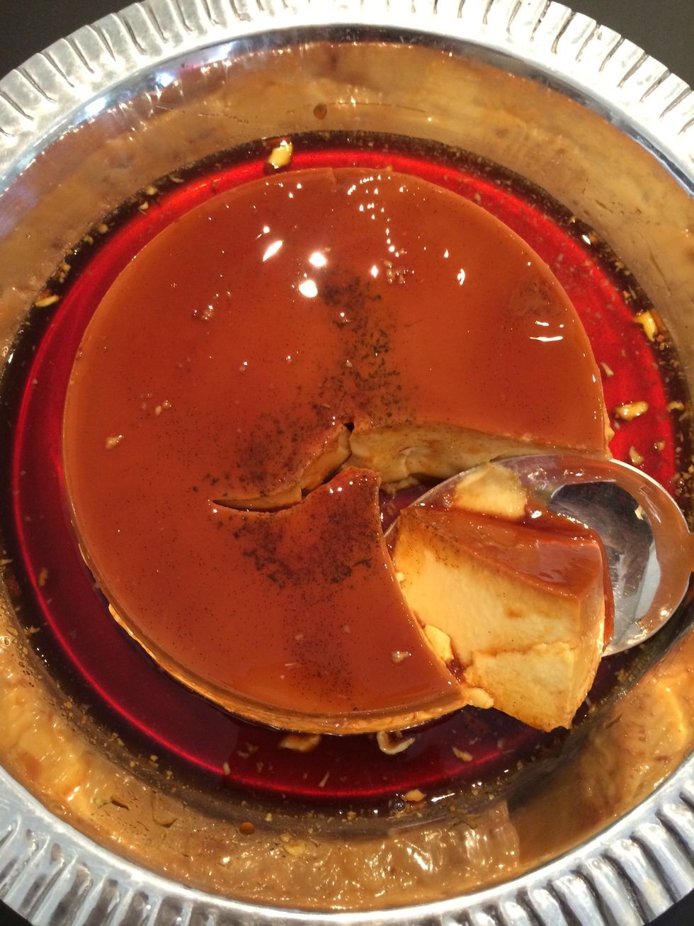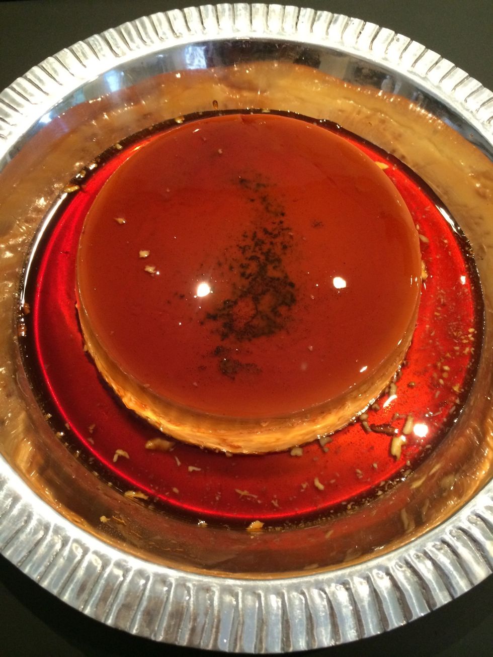 Turn upside down. A metallic serving dish gives a beautiful reflection of the desert and the transparency of the golden caramel...otherwise any serving dish that holds the liquid caramel.