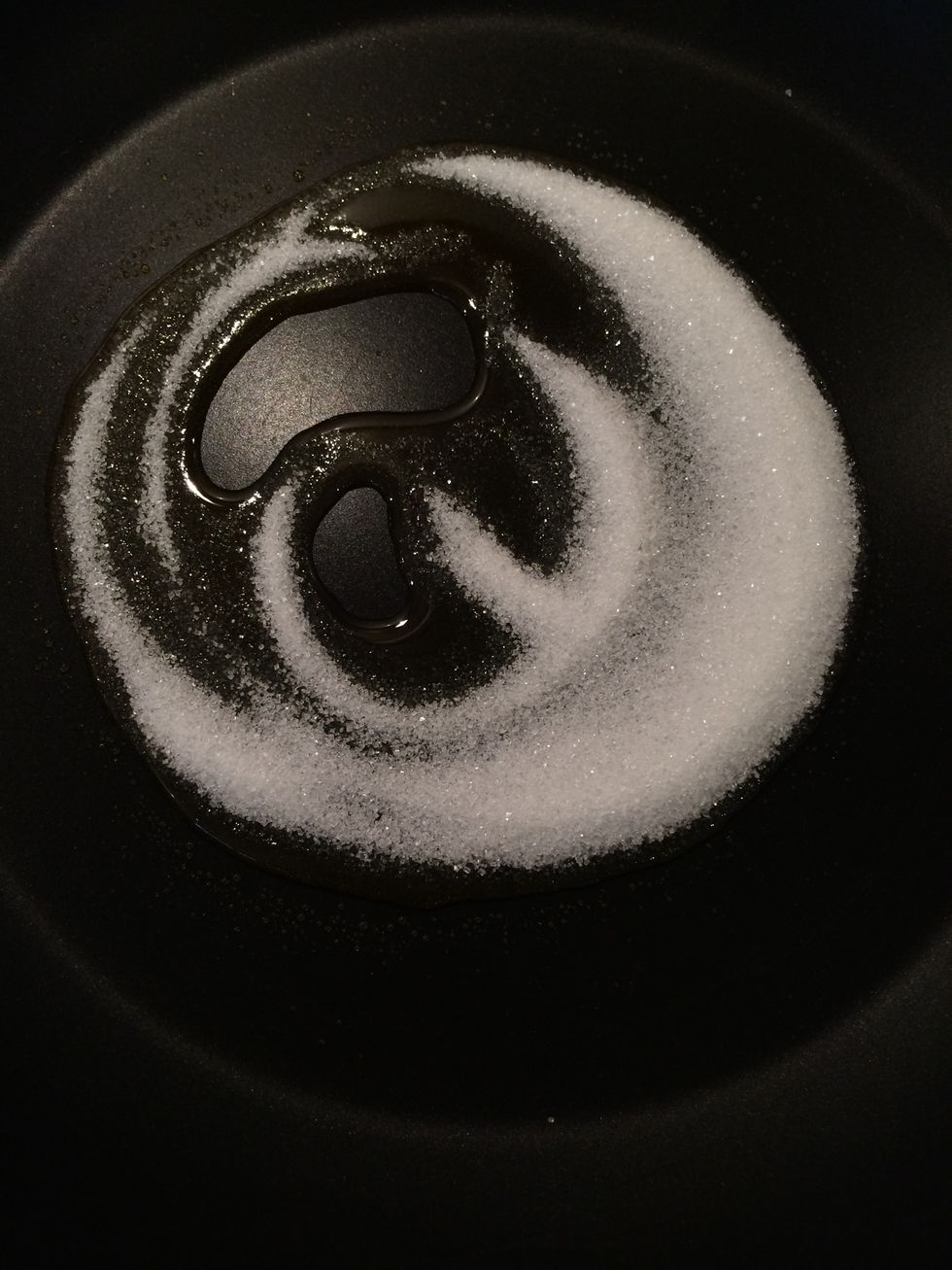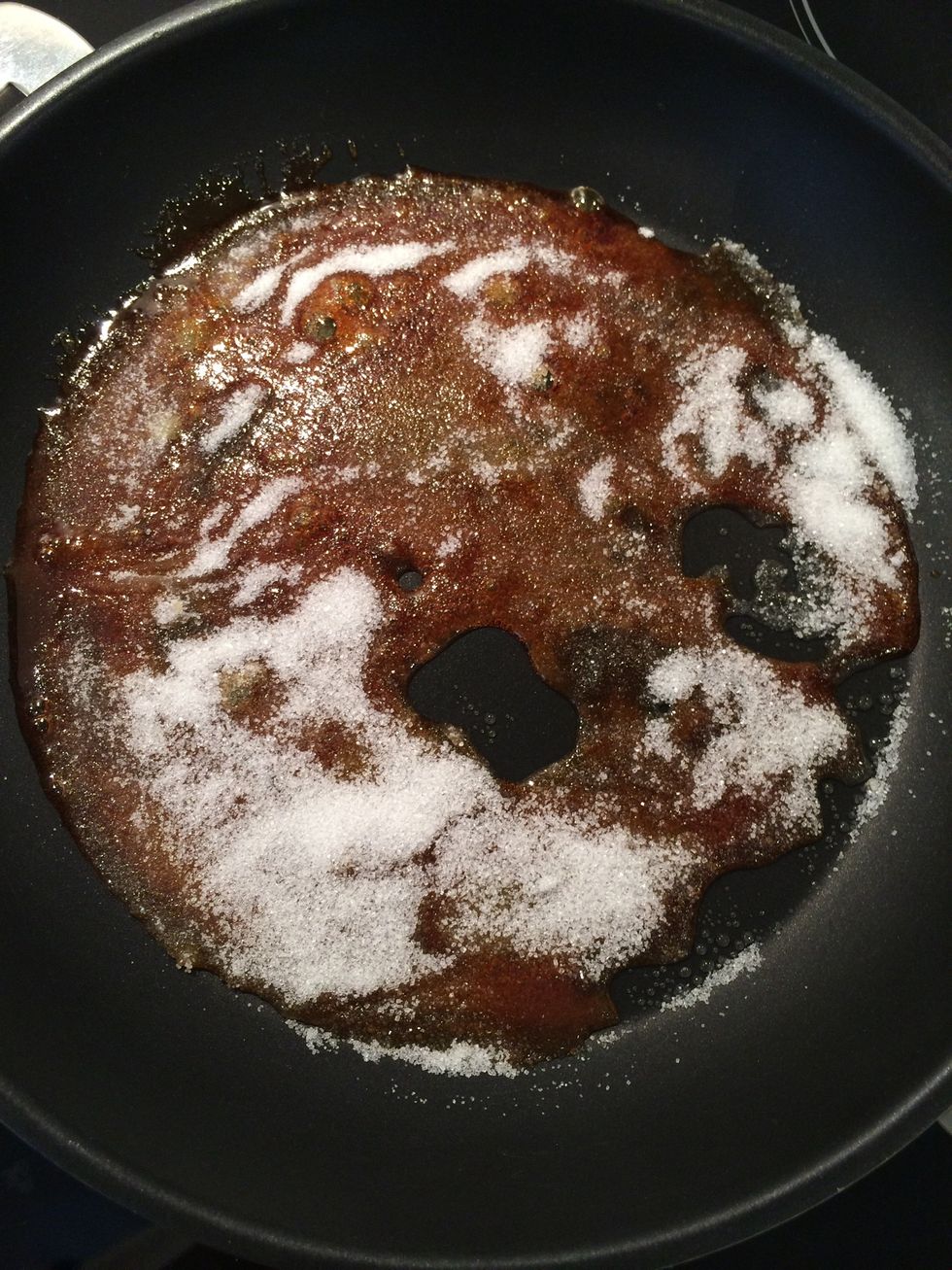 In the pan and on high. Start the caramel by putting 1/4 of the sugar