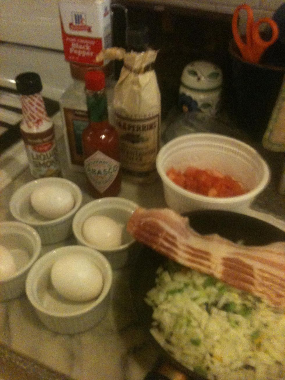 1 chopped Onion 1 green bell pepper 3 sweet peppers 1 tomato chooses Bacon Bacon Grease Sheedded cheese Eggs Liquid smoke Lea and perrins Worcestershire Pepper Salt Tobacco (optional)