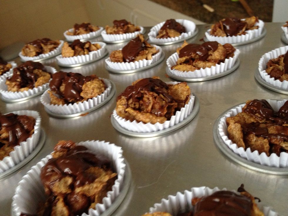 Line mini cupcake tins with paper cups. Fill each paper cup with 1 teaspoon of the mixture. Then let it sit in the fridge for at least 30 minutes. Garnish with melted chocolate before serving.