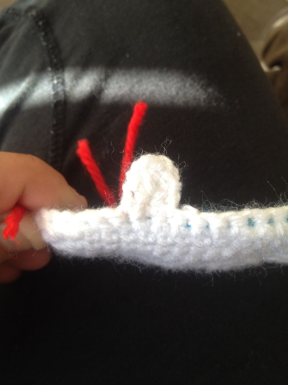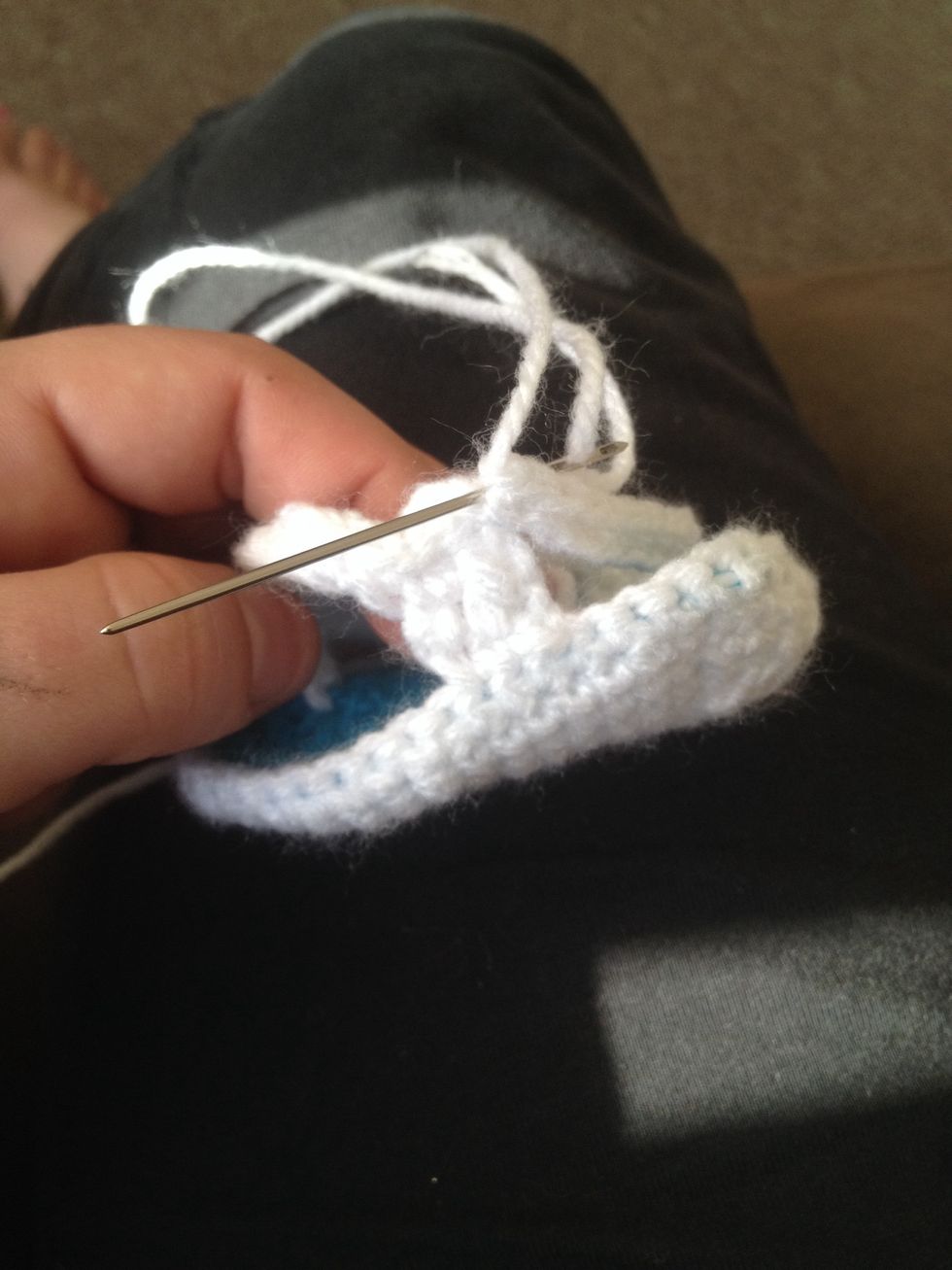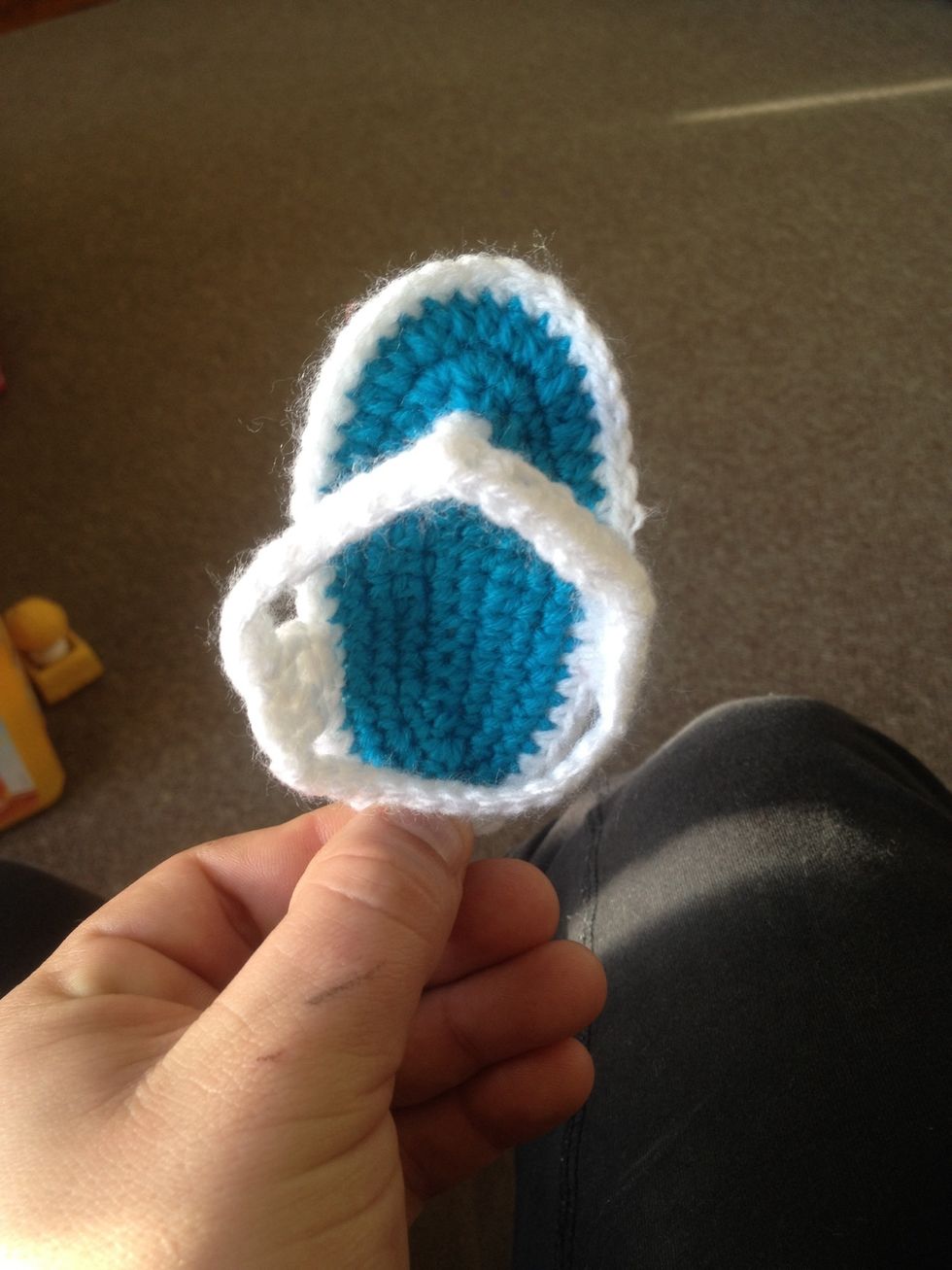 Now turn the sole around so bottom is facing you and do a single crochet into the first top stitch then do a half double crochet, half double crochet and fasten off leave enough length to see in end