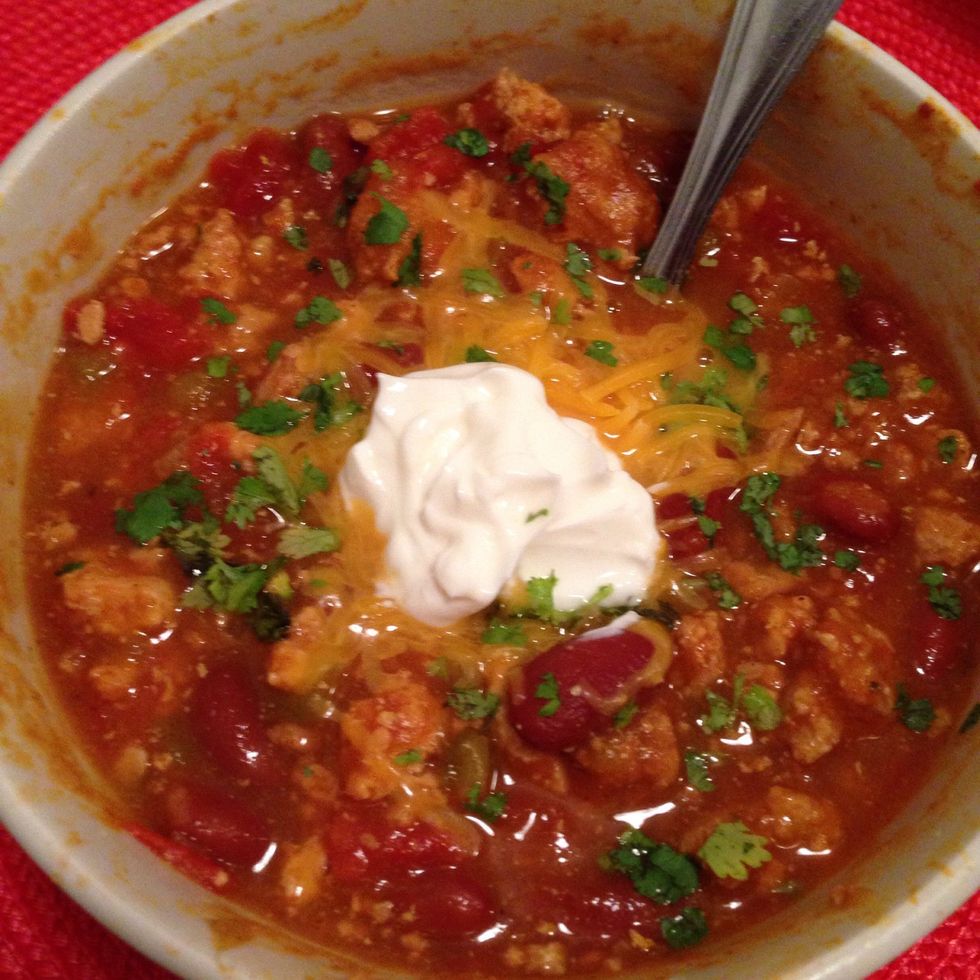 A bowl topped with cilantro, shredded cheddar, & light sour cream.