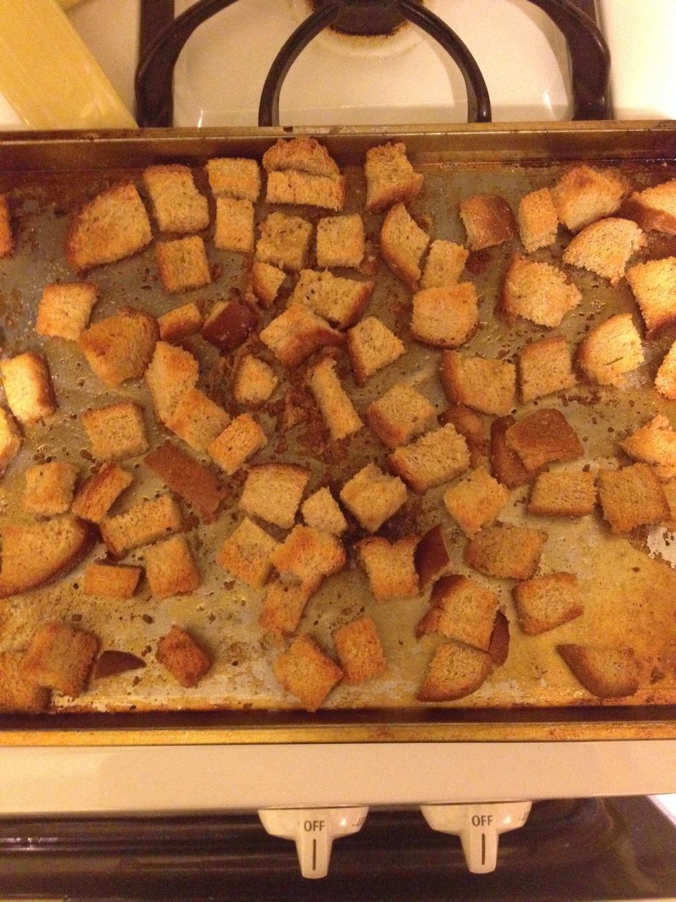 Bake for 14-16 minutes or until gilded brown. The croutons will harden as they cool. For maximum crispiness, use right away rather than storing for another day.