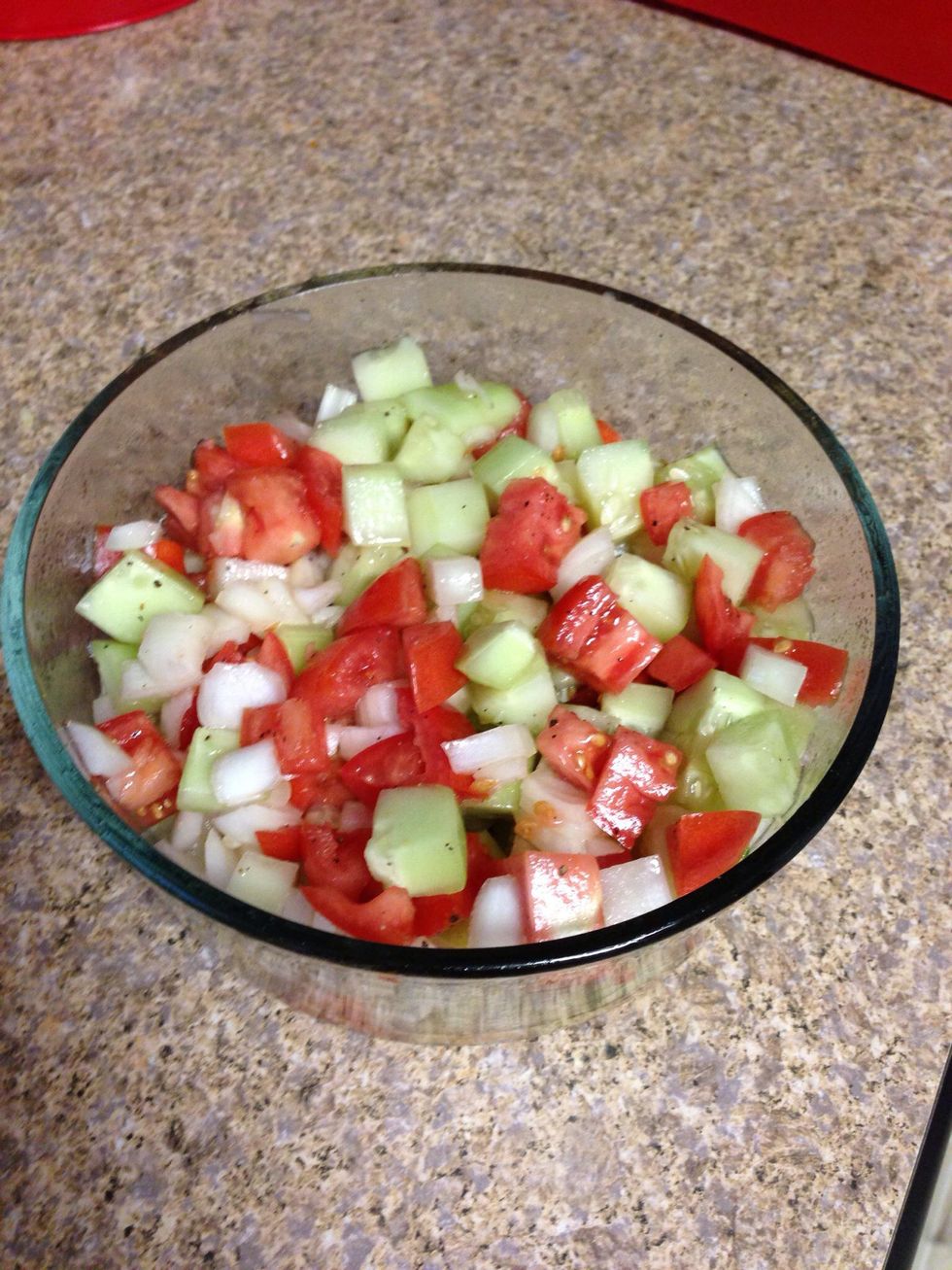 Pour your oil and vinegar over your cucumbers, tomatoes and onions