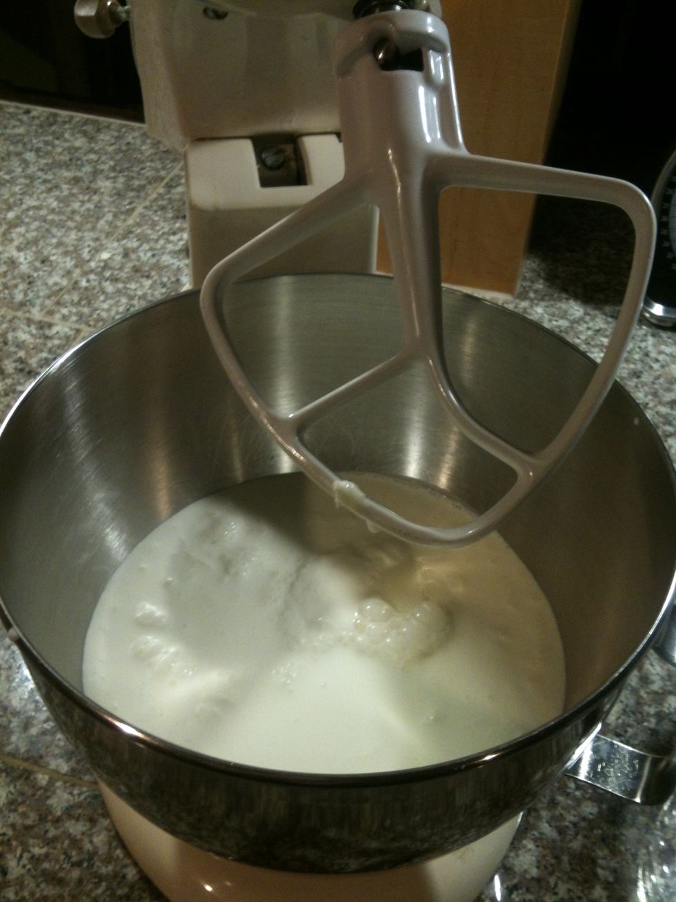 Then churn in mixer. Cream will whip, cream peaks form and fall.