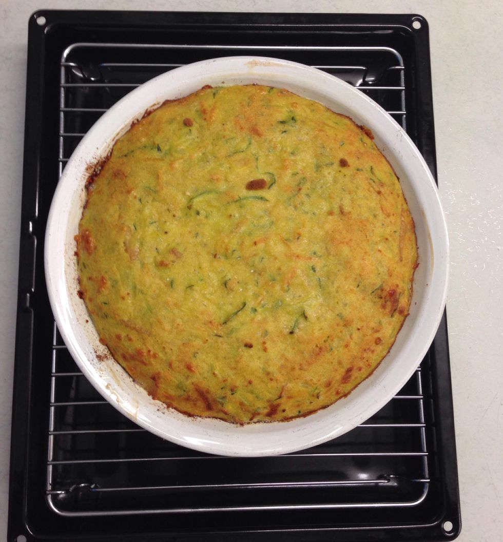 Place mixture into a greased pie dish and sprinkle with Parmesan cheese (optional) Bake in a preheated moderate oven about 180 degrees celcius for 30 minutes or until the pie is set in the middle.