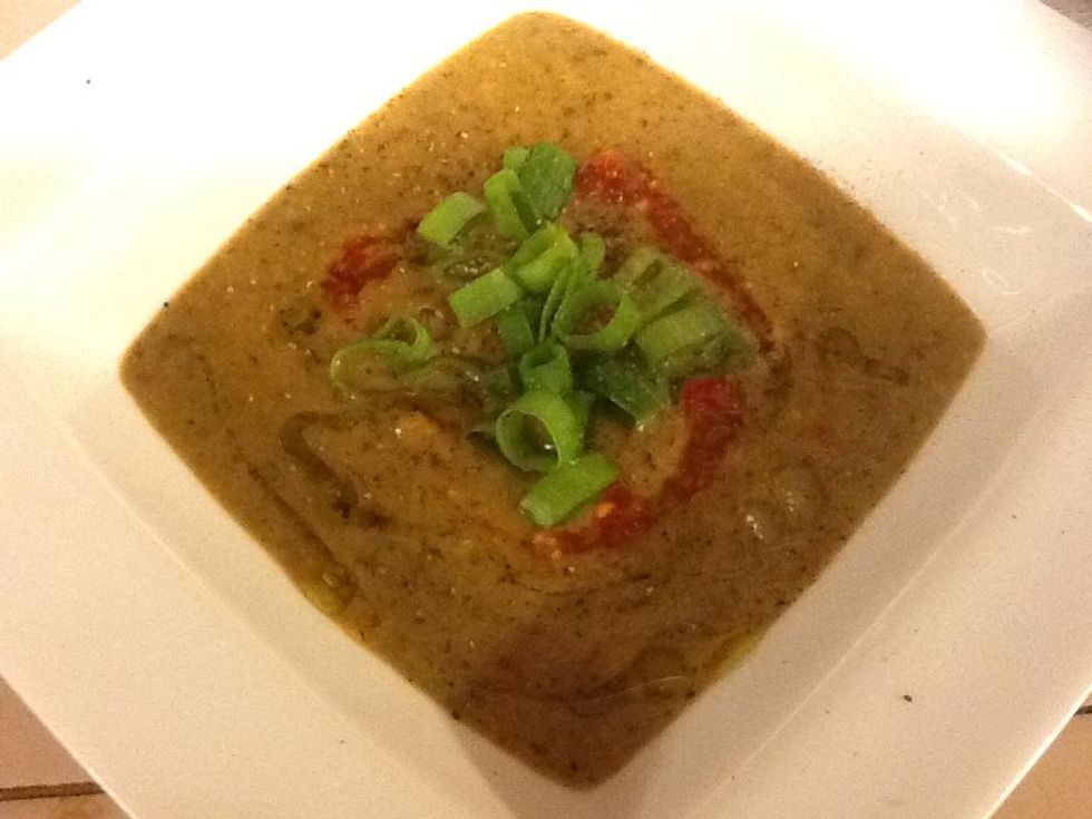 Plate soup and garnish with scallions , a touch of olive oil and a little chili sauce for added heat.