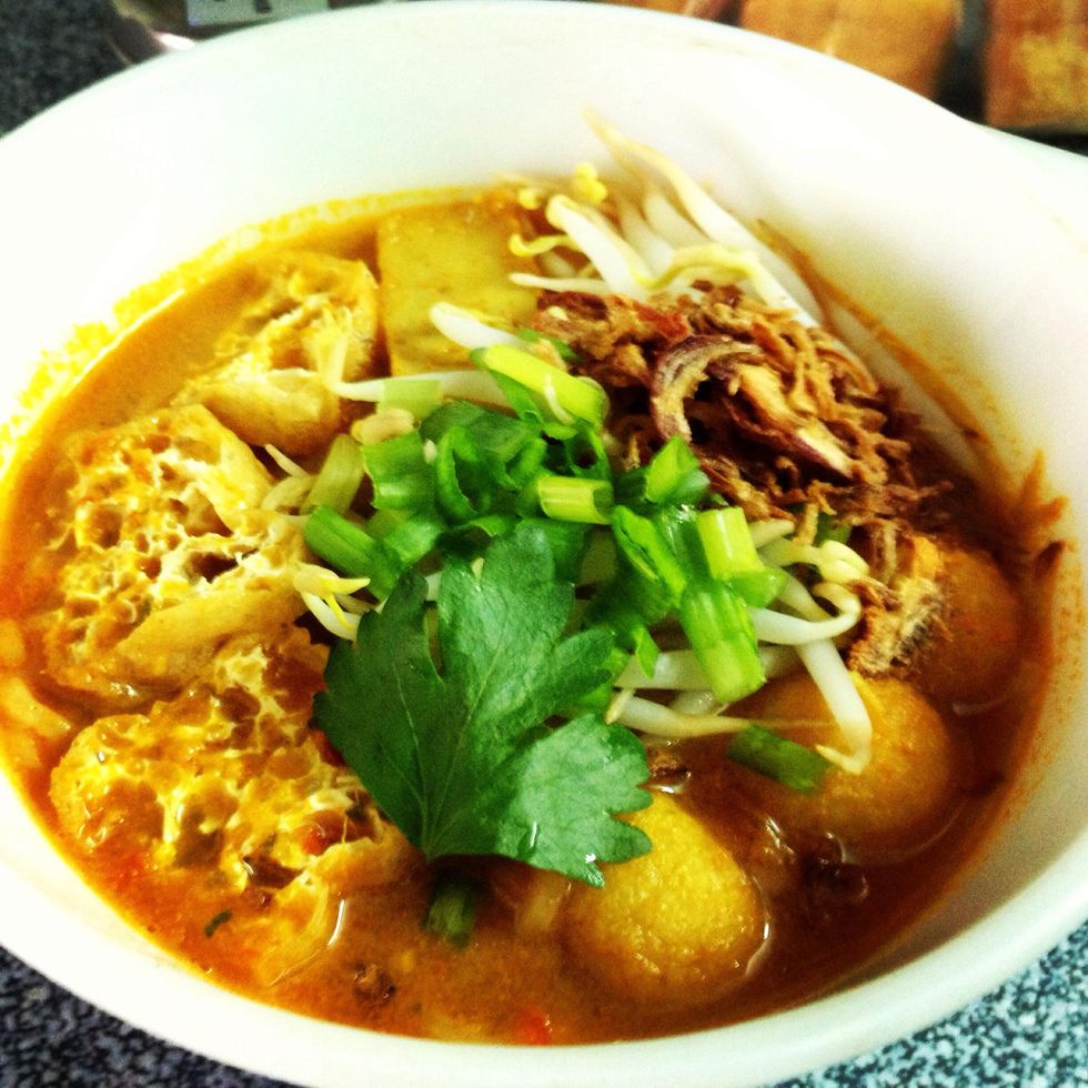 Portion yellow noodles and bean sprouts in a bowl and add fried tofu. Pour hot curry with the fish balls and fish cakes over and garnish with fried shallots, spring onions and coriander leaf.