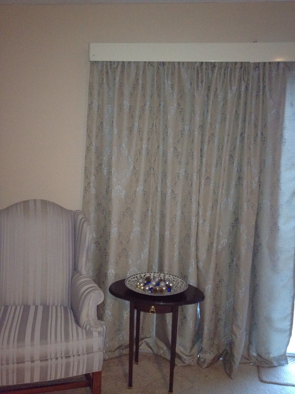 Then I sew the top 'rod pocket' a 1/2 inch in from cut. Pulling pins out as I go. I repeat this step only I sew about 2 inches from folded edge to create top 'ruffle' about rod pocket.