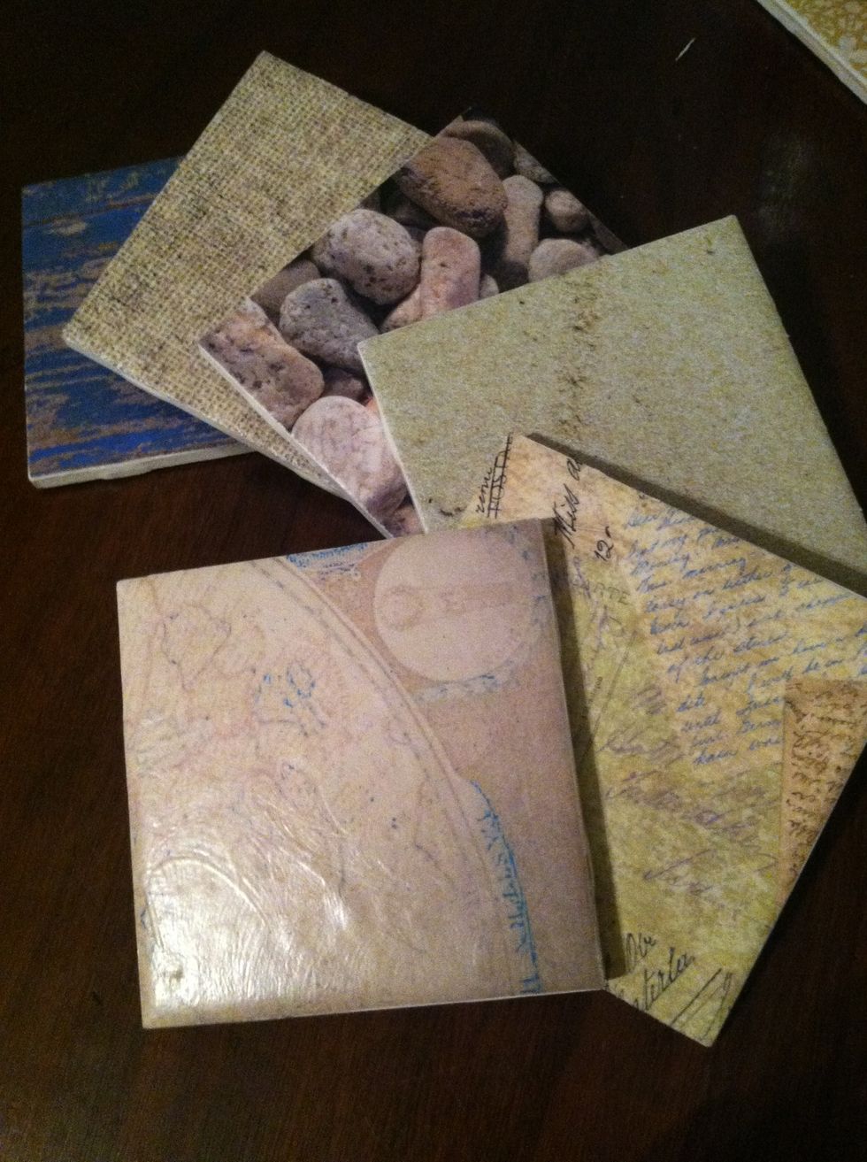 I'm making these tiles for my mom's birthday! She and Dad have a blue/beach themed room, so I chose a mostly neutral palate. It's subtle enough they can use most of the coasters anywhere in the house.