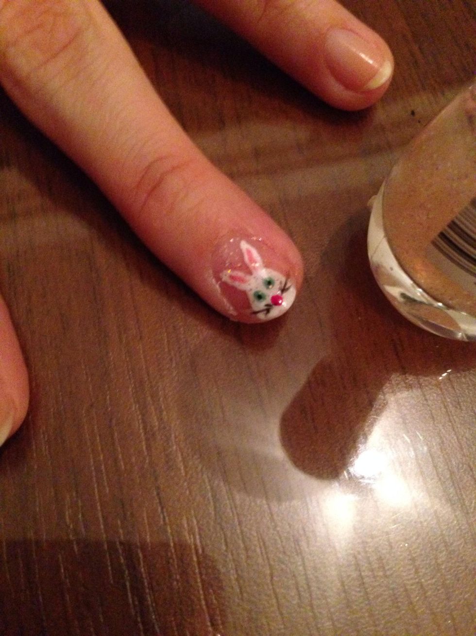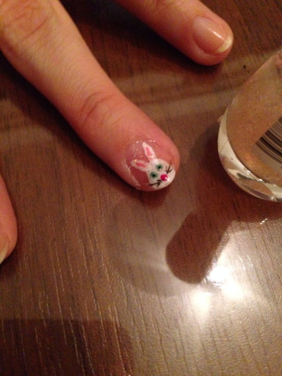Make two dots with the blue or green polish as these will be the eyes. P.s. Don't use too much polish, it won't dry well and mess up your bunny.