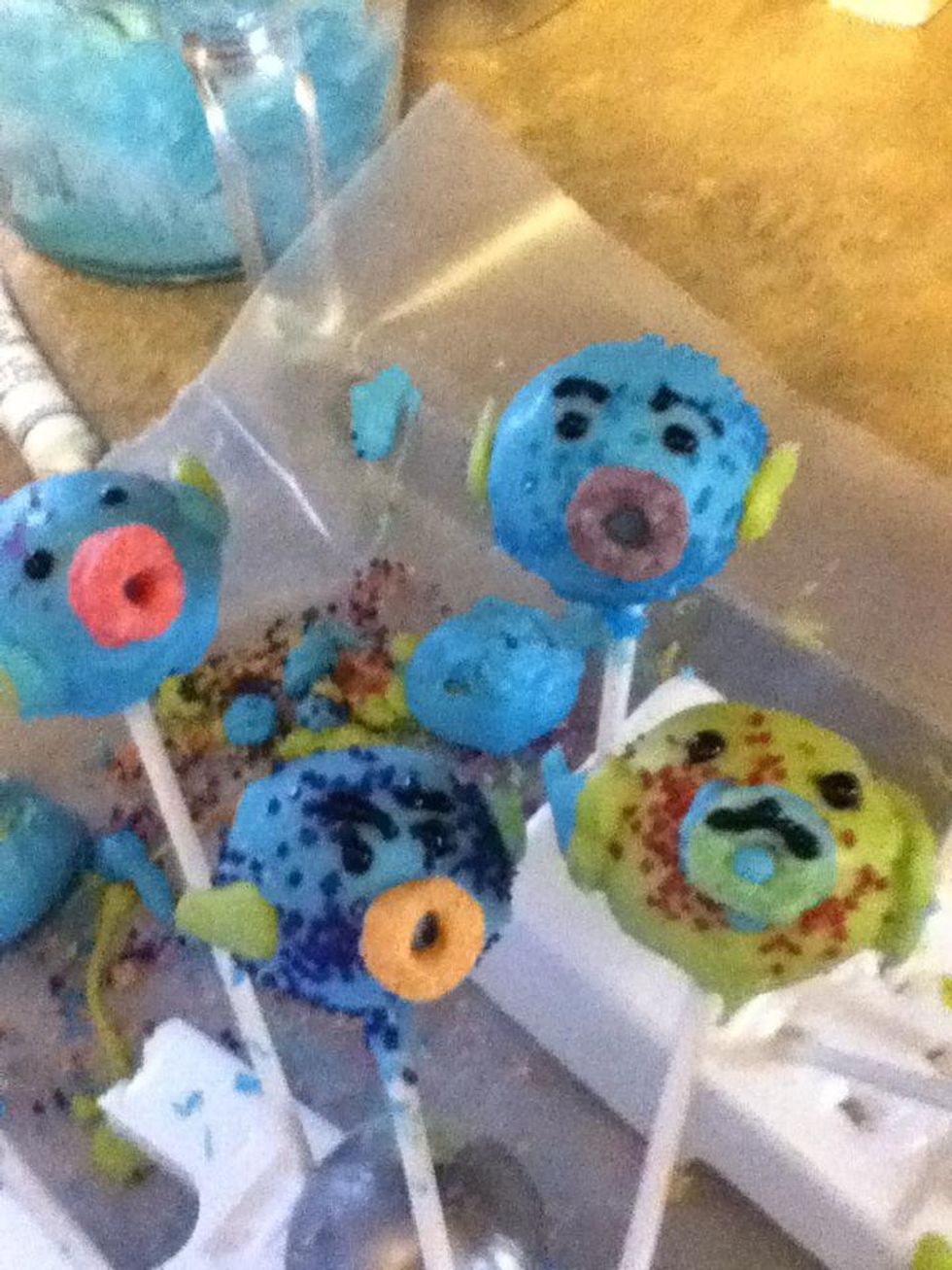 Attach fish lips by dipping the fruit loops into the candy and pushing them onto the cake pops.