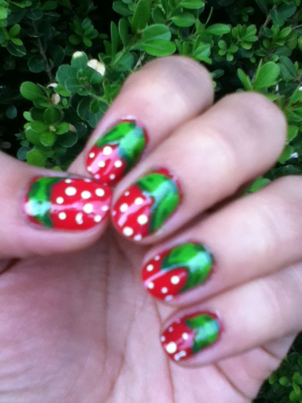 Fill the leaves with the green polish Outline them with a darker green and add some white dots for the seeds of the strawberry!
