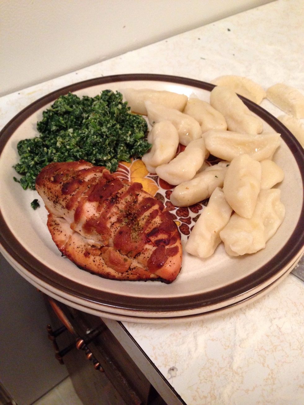 I was baking some chicken breast on butter with just salt, pepper and little mustard on the top. As a side I also cooked some spinach on butter with an egg. Approved by my man, said it was yummy :)