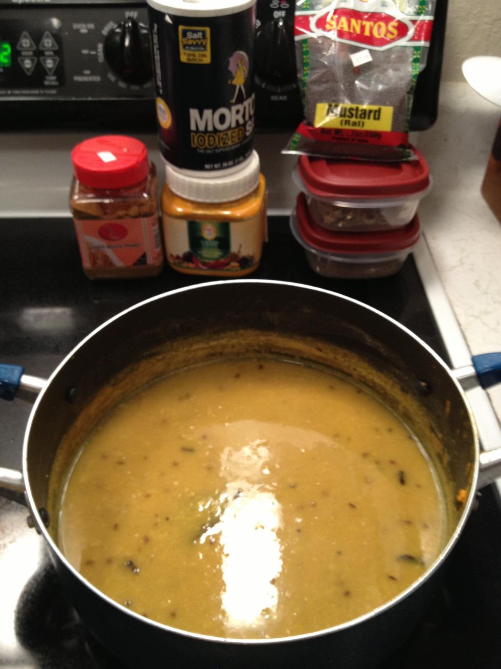 While dal cooks, heat ghee in a small pan and add spices. This masala is made with mustard, cumin and coriander seeds and a little clove. Heat slowly. When mustard seeds start to pop, take off heat.