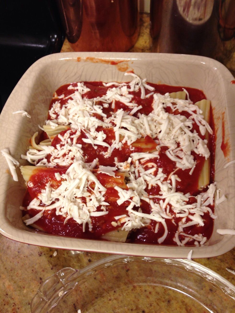 Fill manicotti until either you run out of pasta or run out of tofu ricotta mix.