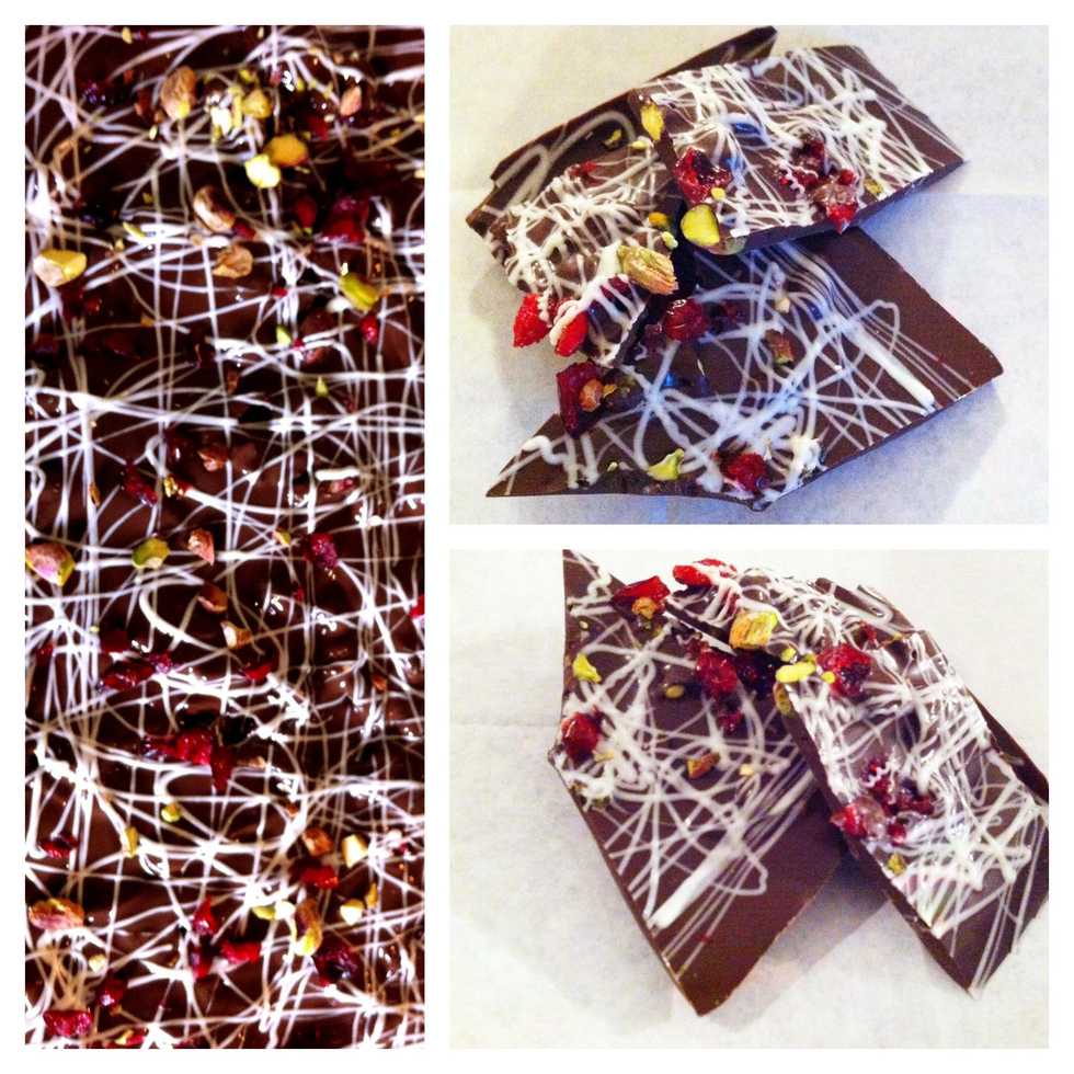 Add cranberries & pistachios. Microwave white chocolate wafers & add to squeeze bottle. Drizzle all over bark! Refridgerate for 30 minutes. Break and enjoy.