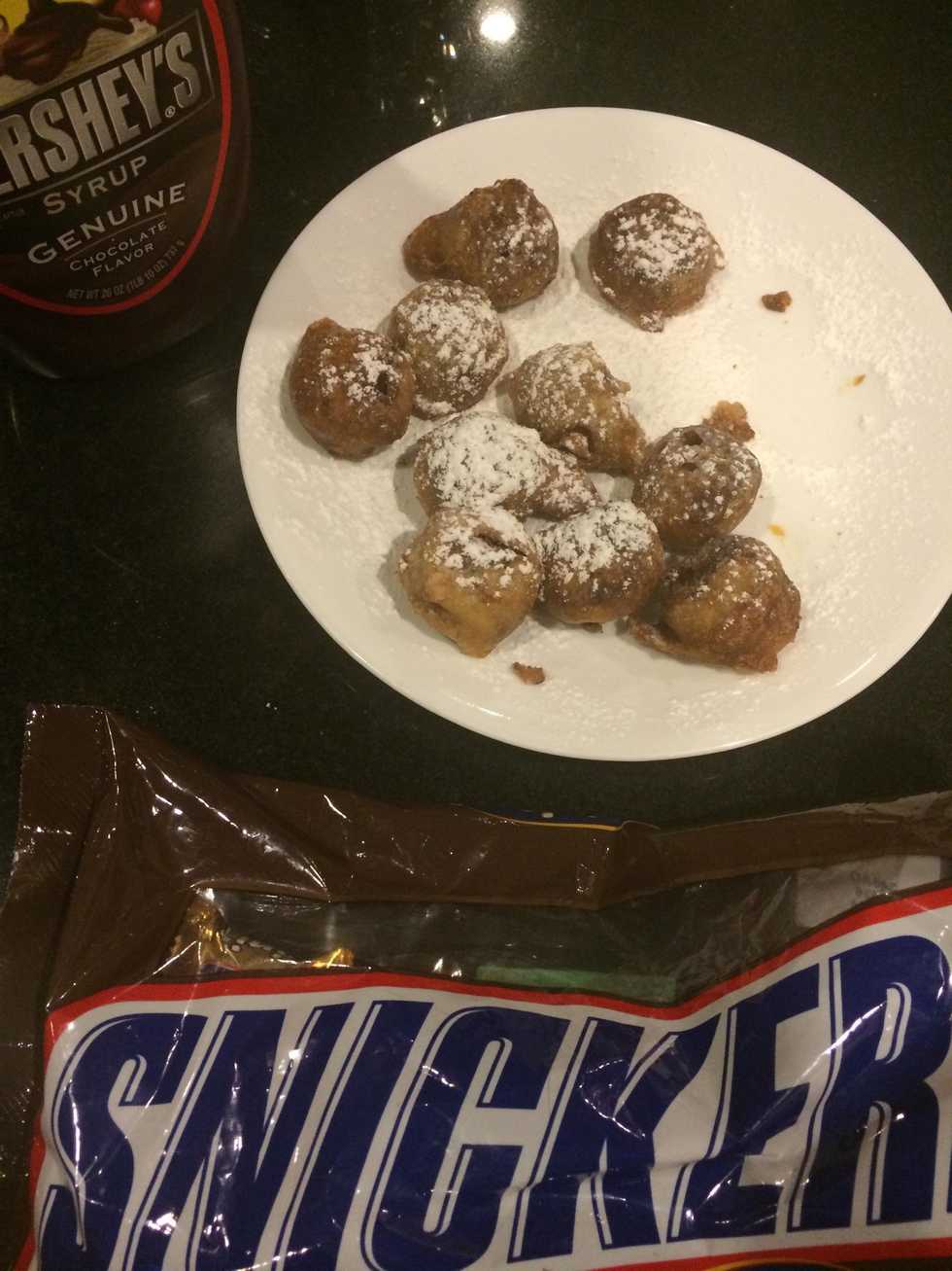 Make certain you have put the Snickers in the freezer at least 6 hours before you fry them. I like to freeze them a couple of days.
