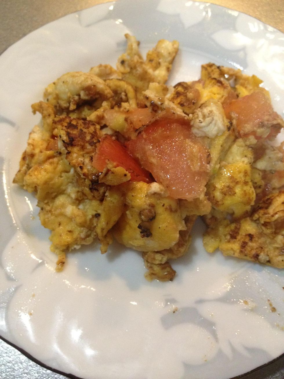 Get suppliesCrack egg in bowlShould look like thisAdd saltCut a quarter of tomatoeThe quater of tomatoeAdd then mixGood source of protein and veggies!