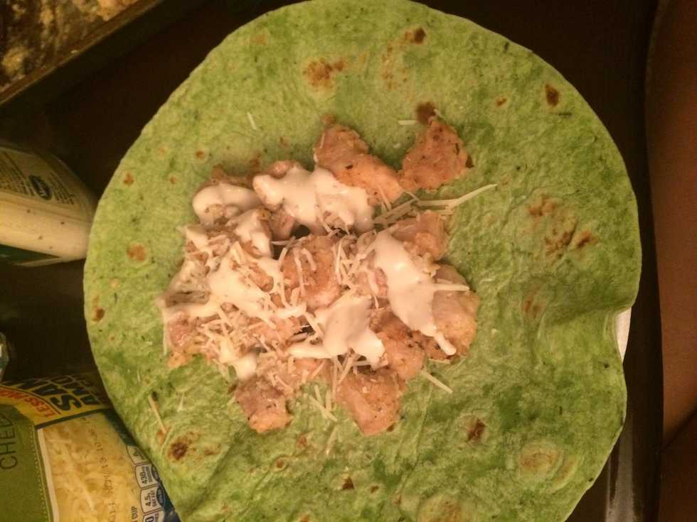 Put chicken, cheese and dressing in the tortilla!