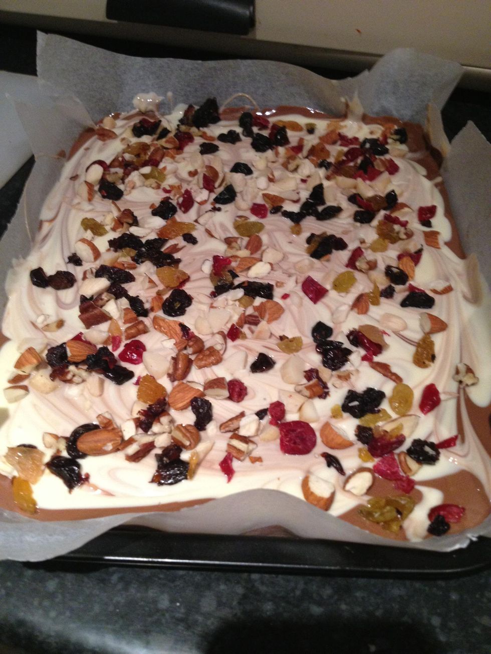 Sprinkle chopped fruit and nuts all over. And put in the fridge to set.