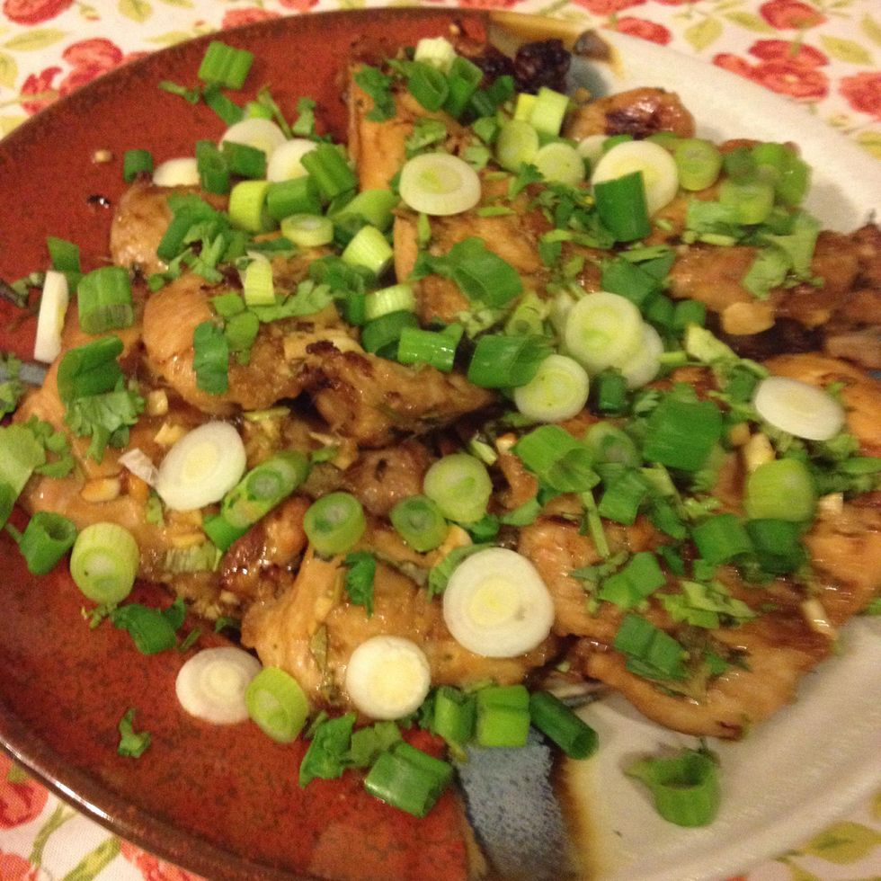 To serve, sprinkle the chicken with scallions, the cilantro and any sauce from the baking dish. OK, I got carried away and you can hardly see the chicken BUT believe me, this is SO delicious. Enjoy!