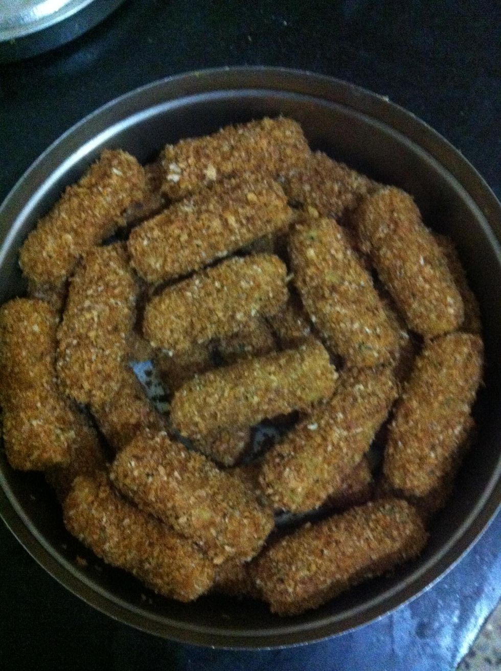 Roll them in finger shapes, dip in egg and roll them on bread crums....ready