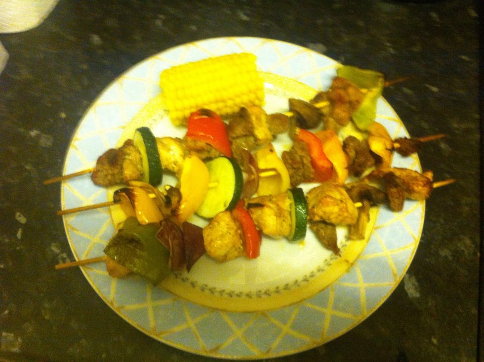 You can arrange the kebabs as you like, I normally put one meat and one vegetable.... But do it as you prefer...