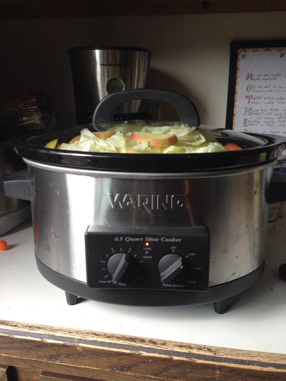 Add another later of cabbage, oil, salt & pepper. I had a soft apple with a little bruise so I cut that up and tossed her in.