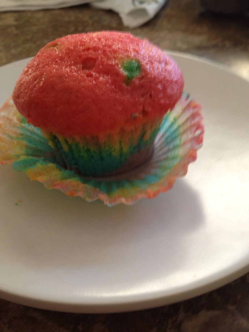 Put the batter in 6 containers and put the amount of food dye you want to each you need: red,orange,yellow,green,blue, and purple add a fork to each container to mix