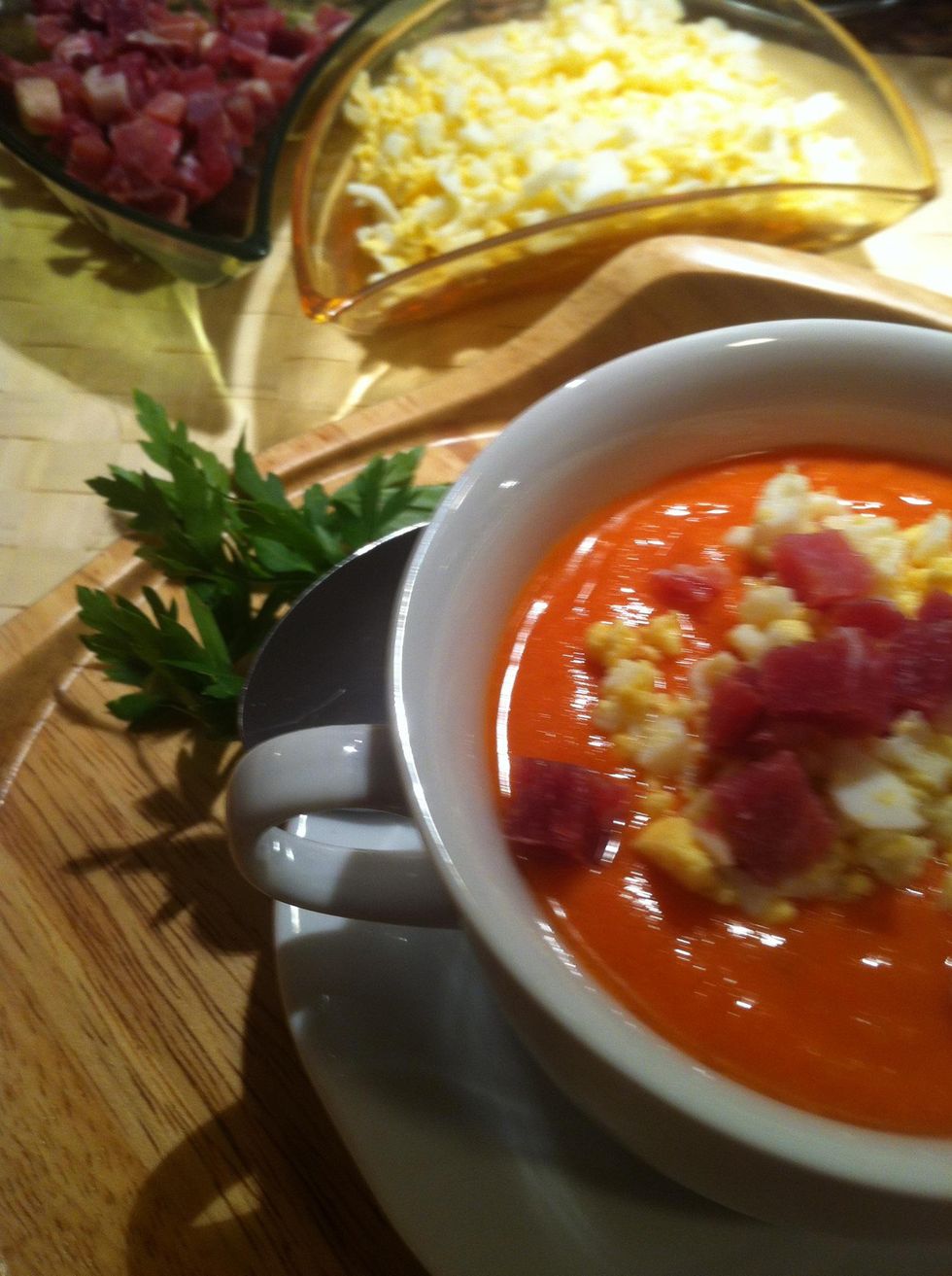 Another way of serving: toast some small slices of bread. Put some Salmorejo on them.