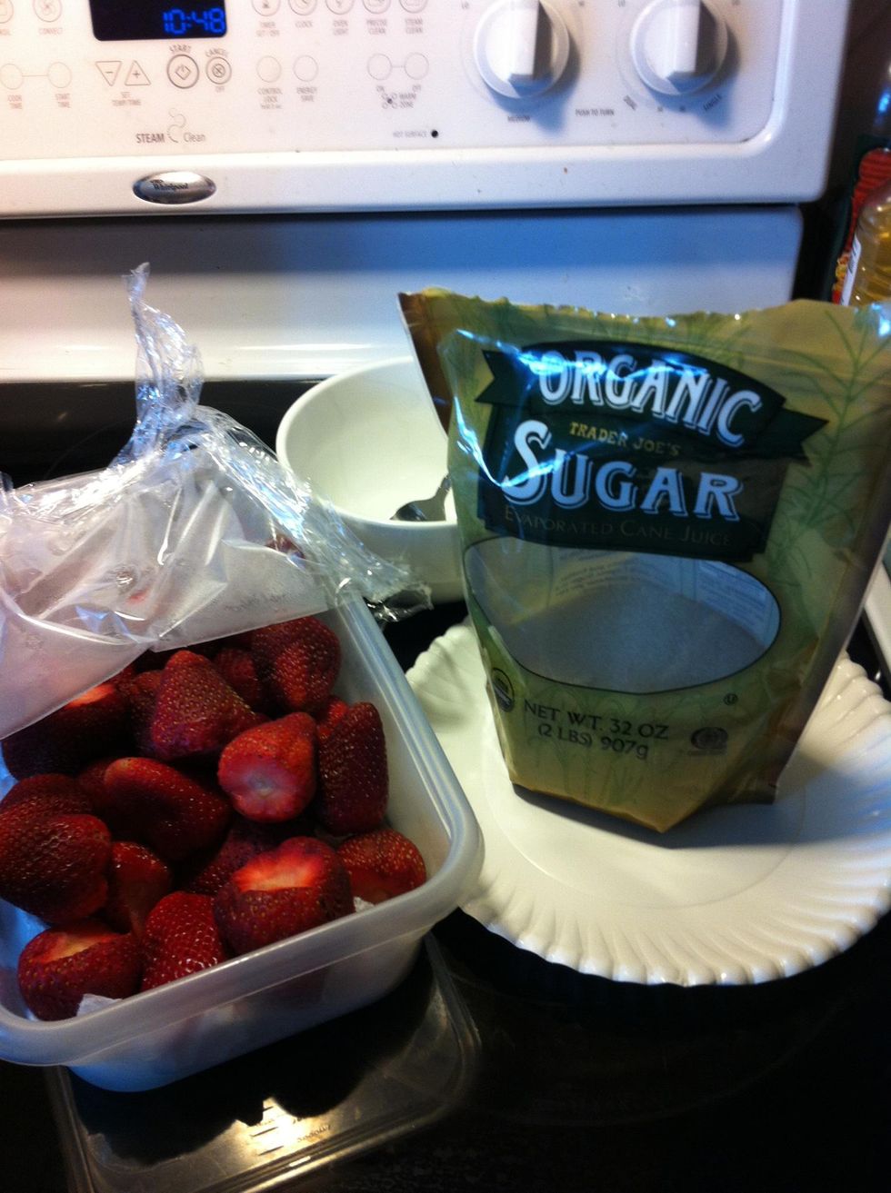 Gather your suppliesGet your knife your plate/cutting board your bowl and you strawberriesNow cut up the strawberriesNow repeat that for how ever many times you want.Now add how ever much sugar you wantEnjoy!