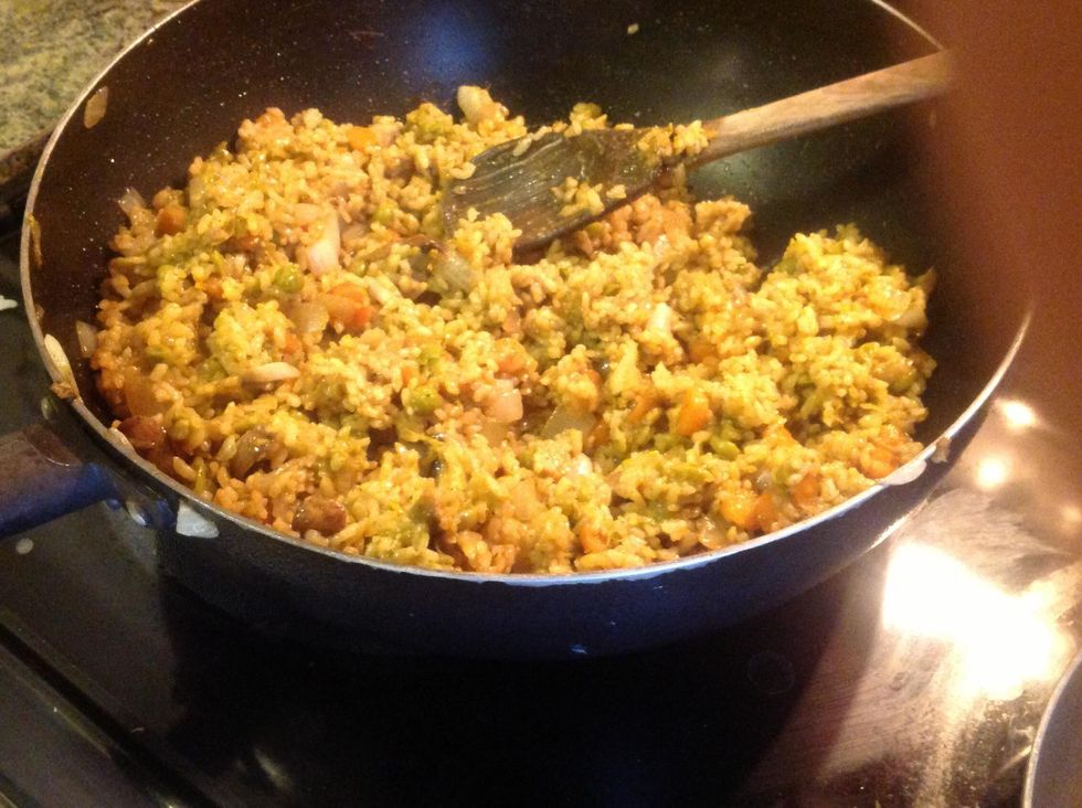 Dump the rice on top. My rice was more sticky than dry. When making fried rice, it's better to have dry rice. But then again, I'll happily eat it no matter what rice is used :)