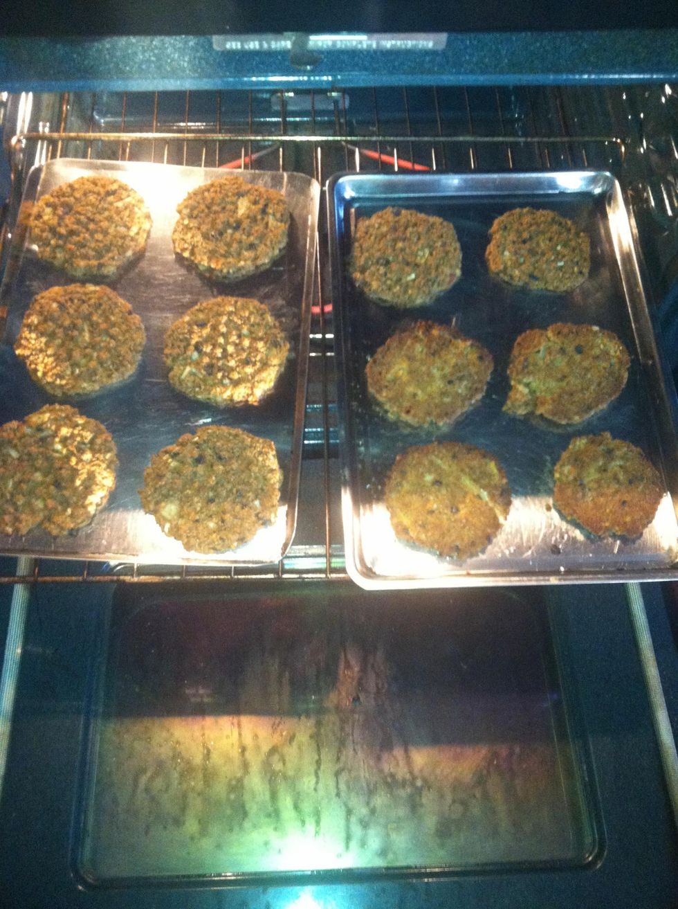 Put in the oven at 350f for 45 minutes. Take them out and flip them over with a spatula (very carefully). Return them to the oven and cook for another half hour or until they are firm.