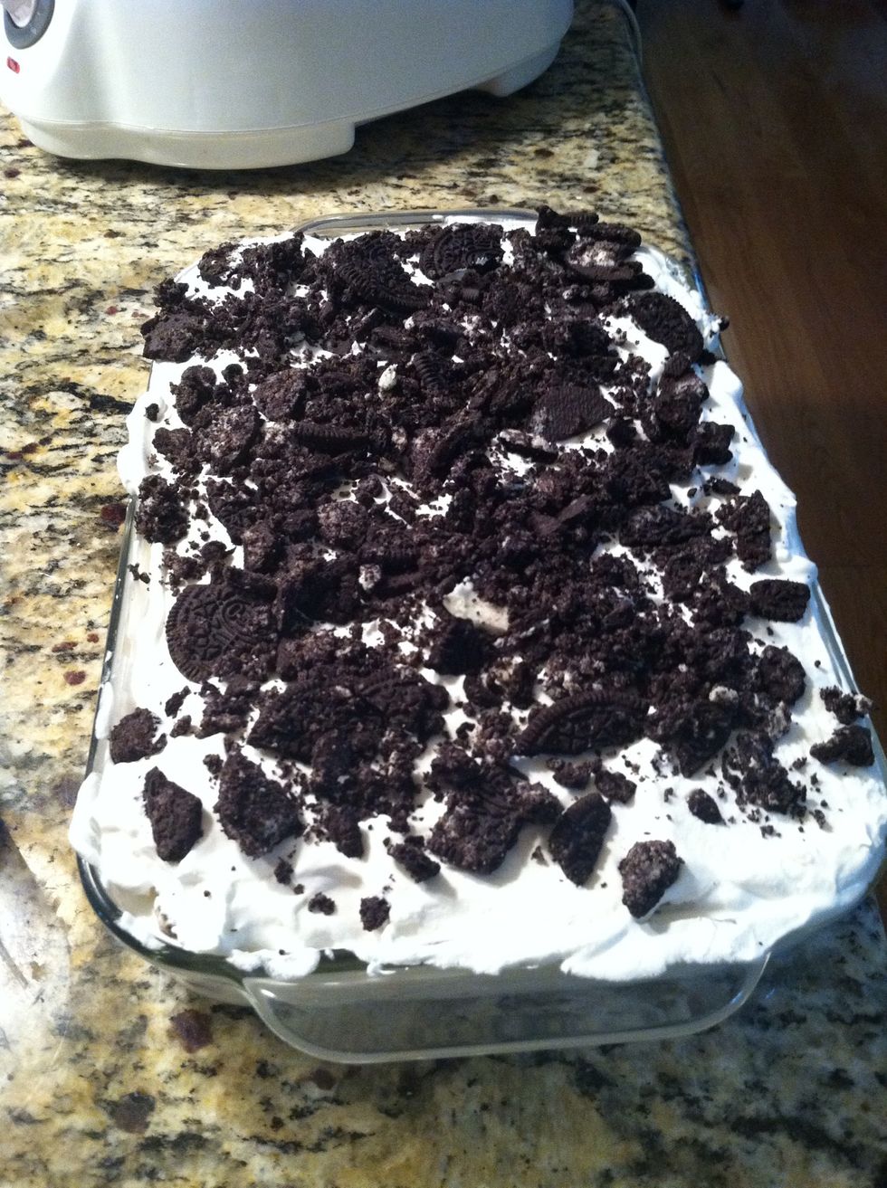 Break Oreos into little pieces then spread on top and pour the chocolate syrup on top