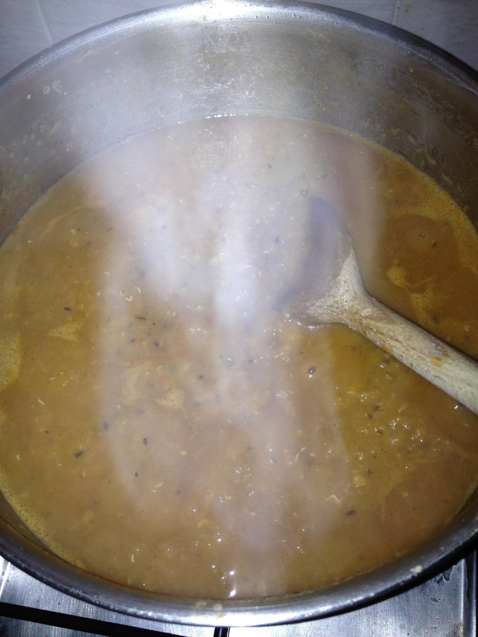 Time's up and you should have a nice thick soup. Serve with bread of your choice, or preferably with boiled basmati rice, which can be made in tandem.