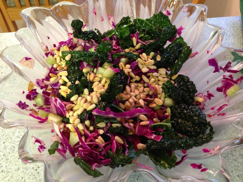Tear the kale leaves away from the tough rib of each leaf, and into bite-sized pieces. You should end up w salad greens, and a bunch of naked kale spines to discard.