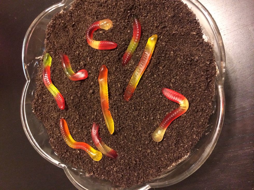 Add gummy worms to top and fake clean flowers if you'd like and a garden tool to dip it out. Set four 4 hours to over night covered in fridge!