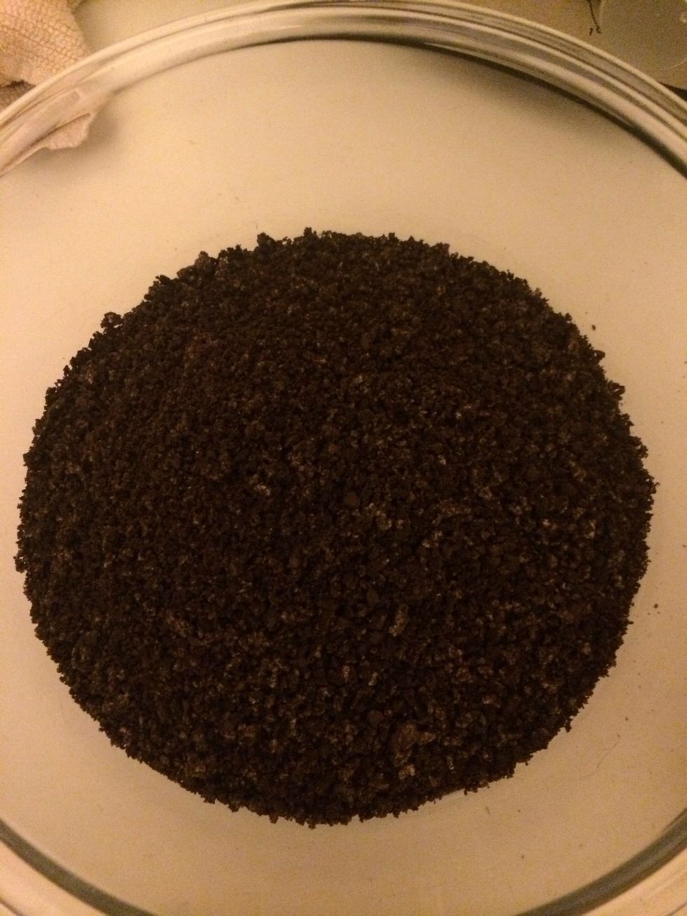 Then in you bowl or you can use a new and cleaned flower pot, add some Oreo crumble to the bottom, this is your dirt