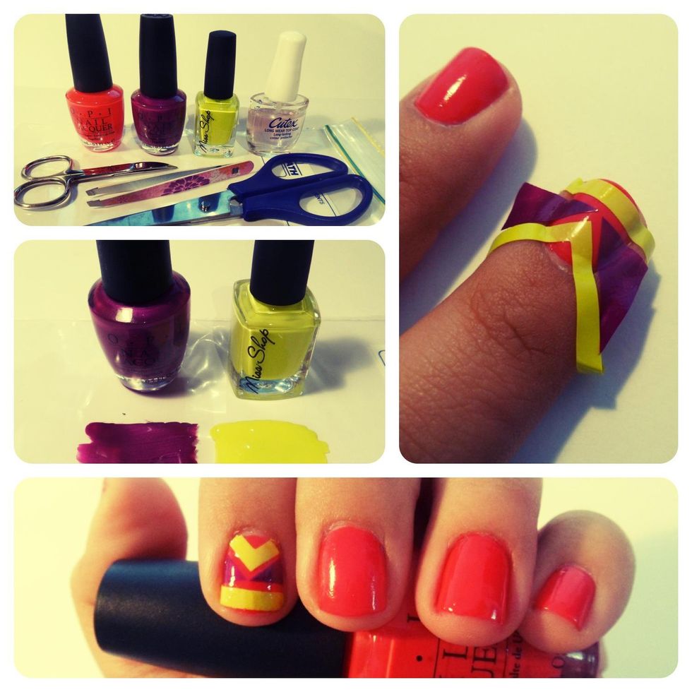 The colors I'll be using include: Cajun Shrimp by OPI, Plugged-in Plum by OPI & Neon Yellow by Miss Shop