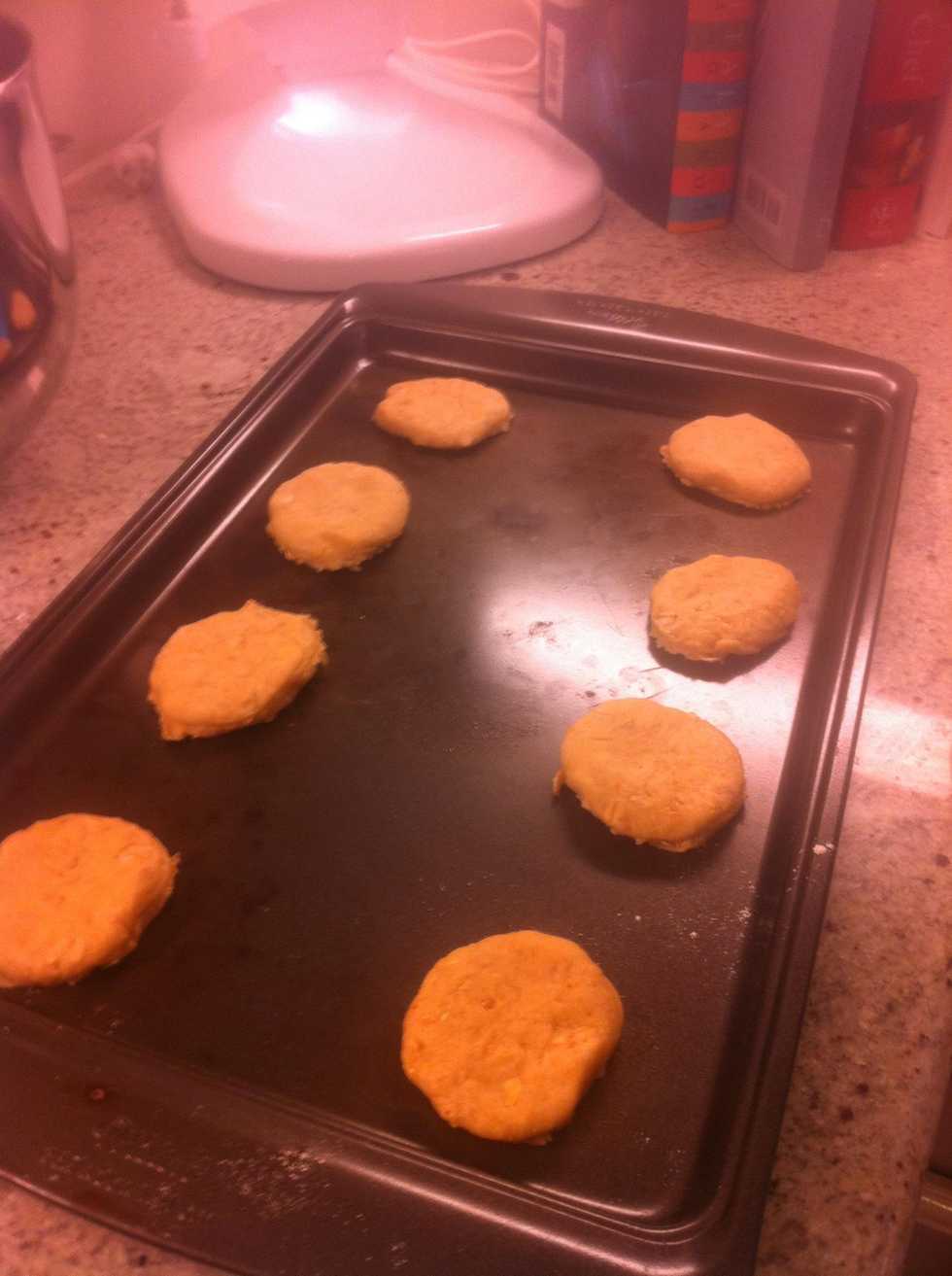 Make it into a shape and put it onto a nonstick pan then put it in the oven for 20 min