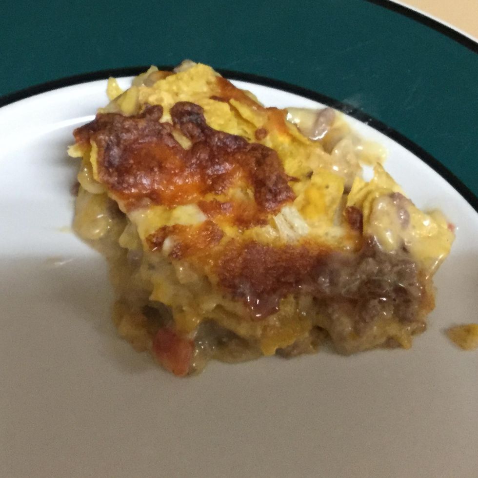 Add another layer of Doritos, continue the layers until dish is full... Put the dish into the oven that has been preheated to 350 degrees for 25 - 30 minutes...