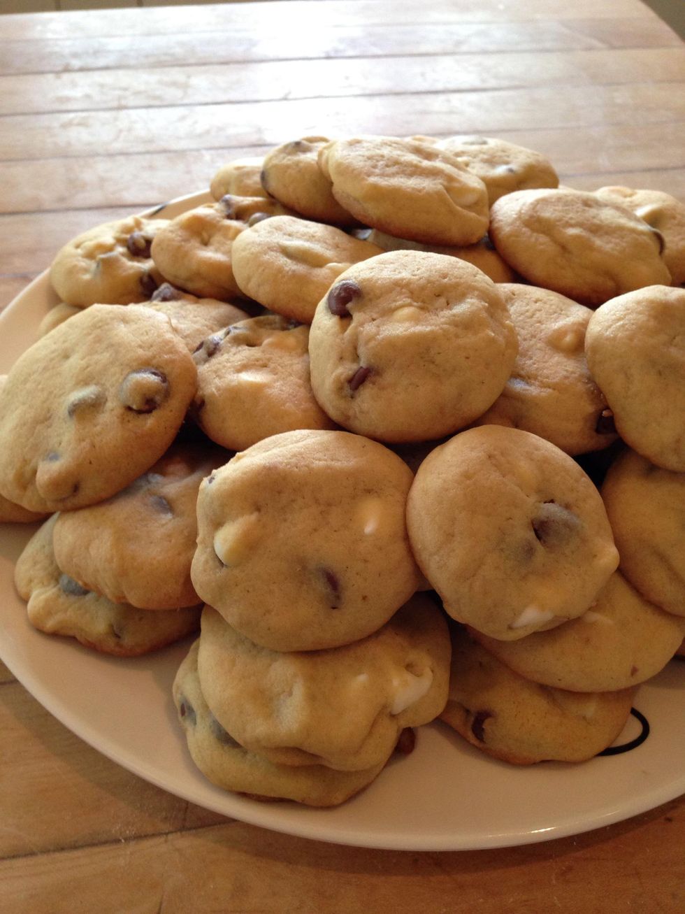 Gradually add dry ingredients to butter mixture, then stir in chocolate chips! (You can substitute the white chocolate for more milk chocolate, they taste good either way!)