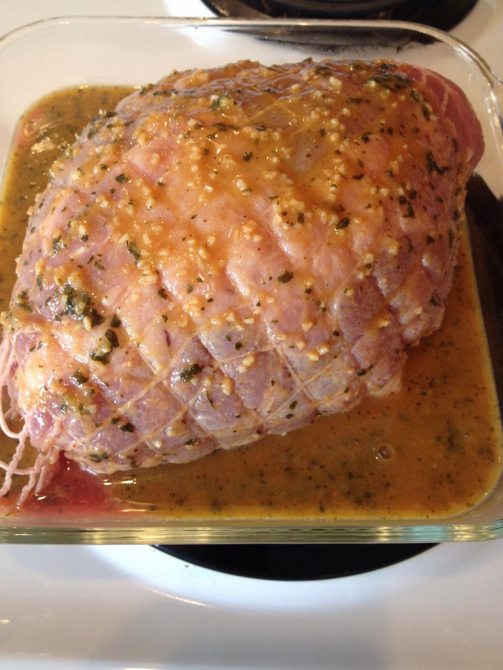 Heat oven to 300 degrees. Place pork roast in 8x8 baking dish, or other small, yet deep baking dish.
