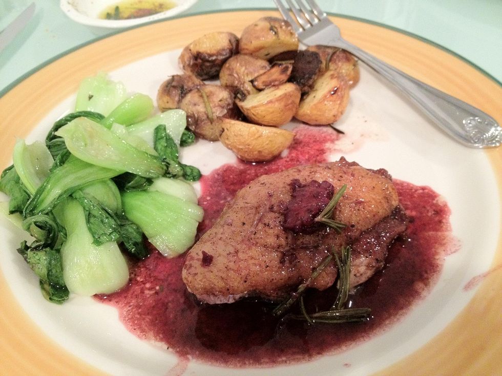 In another pan, cook red wine, balsamic vinegar, stock until reduced by half. Add brown sugar, berries and rosemary, whisk in butter. Drizzle the sauce on top of duck.
