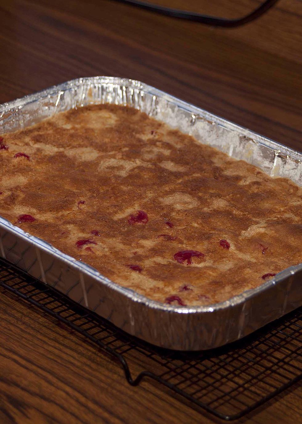 Take it out and let it cool! A lot of people think it's a cobbler and want to eat it warm with ice cream. We like it the following day. It has a nice crust then. You'll have to decide for yourself!!