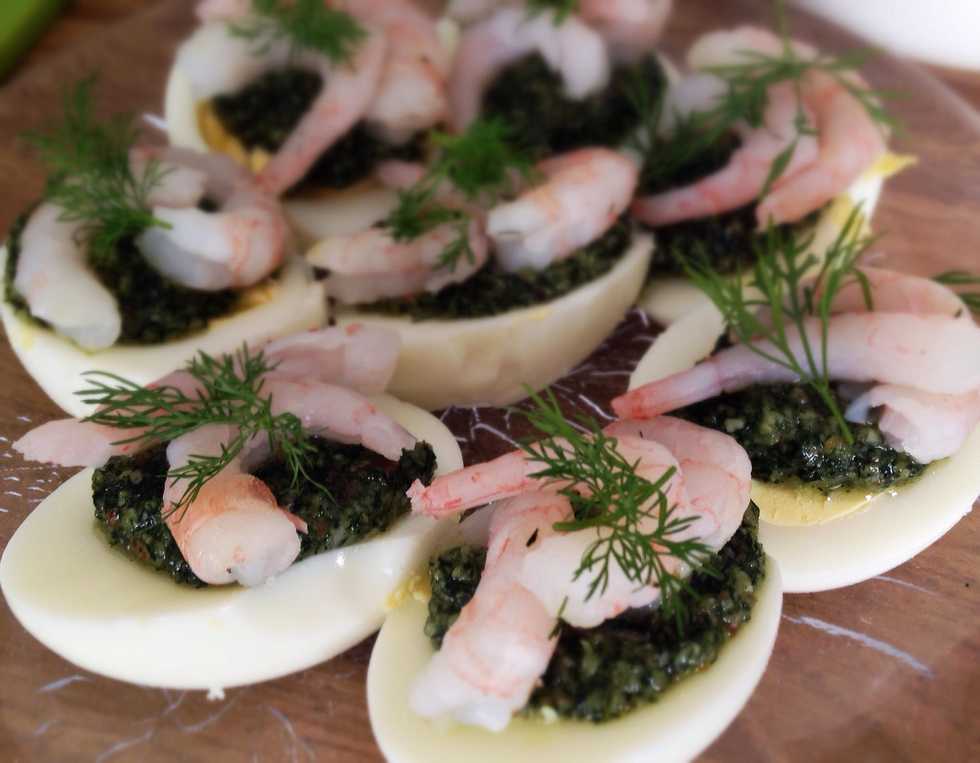 On each egg place 2 prawns and some fresh dill.