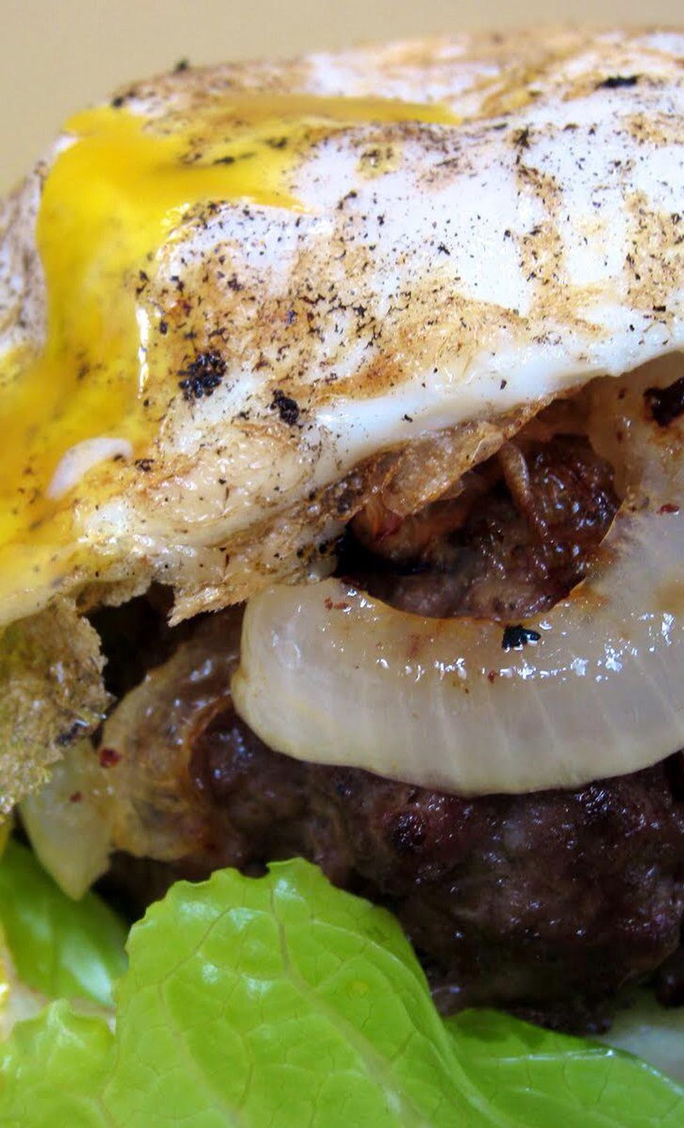 Plate burgers how you see fit. I used romaine lettuce as a base, added the burger and grilled onions, then topped with the fried egg.
